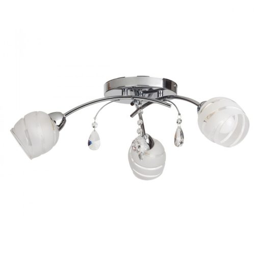 Modern stílusú mennyezti lámpa, króm színű fém vázzal, fehér színű, átlátszó sávos üveg búrával, függő üveg kristály dekorral.