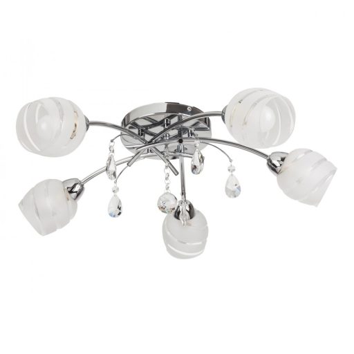 Modern stílusú mennyezti lámpa, króm színű fém vázzal, fehér színű, átlátszó sávos üveg búrával, függő üveg kristály dekorral.