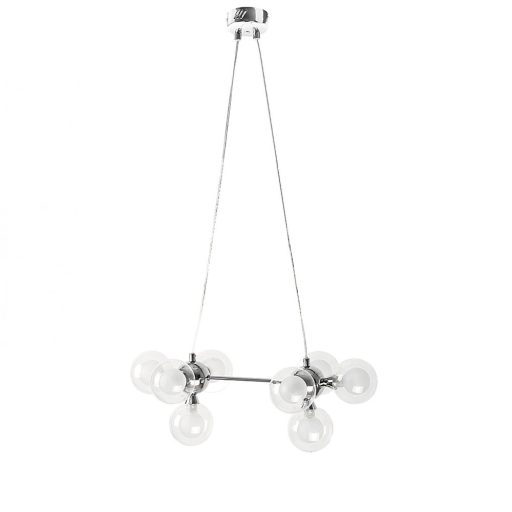 Modern stílusú függeszték, króm színű fém vázzal, gömb alakű átlátszó üveg búrával.