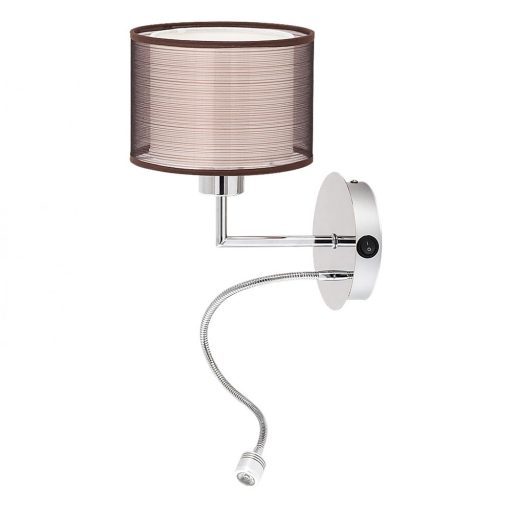 Modern stílusú fali lámpa, króm színű fém vázzal, kívül barna, áttetszó, belül fehér színű textil lámpaernyővel, flexibilis olvasókarral, a lámpatesten található kapcsolóval.