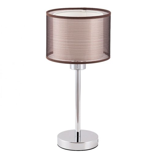 Modern stílusú asztali lámpa, króm színű fém vázzal, kívül barna, áttetszó, belül fehér színű textil lámpaernyővel, vezetékre szerelt kapcsolóval.