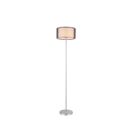 Modern stílusú állólámpa, króm színű fém vázzal, kívül barna, áttetszó, belül fehér színű textil lámpaernyővel, vezetékre szerelt kapcsolóval.