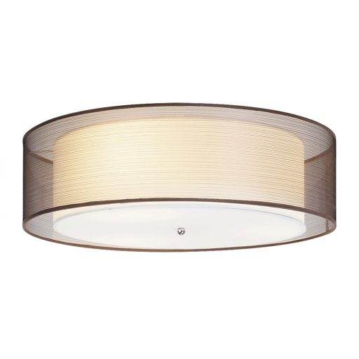 Modern stílusú mennyezeti lámpa, króm színű fém vázzal, kívül barna, áttetszó, belül fehér színű textil lámpaernyővel.