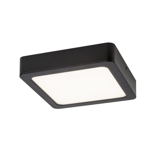 14,5cm széles, fekete színű műanyag keretes mennyezeti lámpa fehér színű műanyag búrával, 12W semleges fehér színhőmérsékletű LED fényforrással.