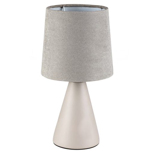 Bézs színű kerámia vázas asztali lámpa bézs színű textil búrával, vezetékre szerelt kapcsolóval.