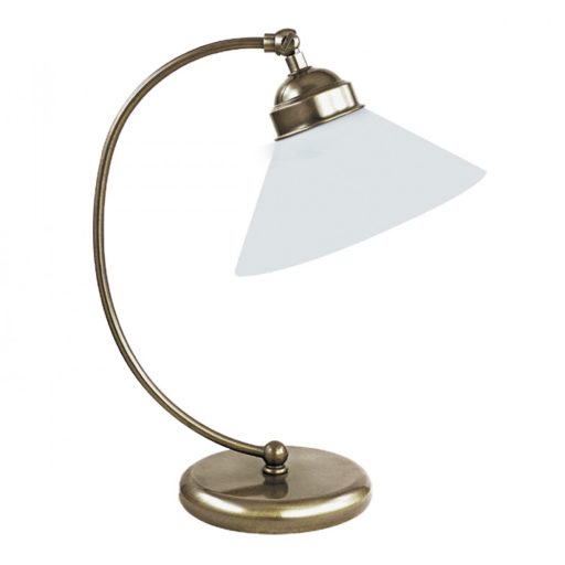 Klasszikus stílusú asztali lámpa, bronz színű fém vázzal, fehér színű üveg búrával, vezetékre szerelt kapcsolóval.