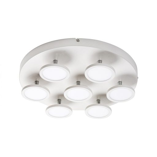 Minimalista stílusú mennyezeti lámpa beépített energiatakarékos LED fényforrásokkal. 40 cm átmérőjű, matt fehér és króm színű, fém és műanyag kombinációjú szerkezet IP20-as védettséggel. A lámpatestben elhelyezett LED fényforrások A+ energiaosztály besorolásúak. 7x 6W teljesítmény mellett 7x 420 lumenes fényerőt, továbbá 4000 Kelvines, természetes fehér színű fényt adnak. A lámpatestben a fényforrások nem cserélhetők.