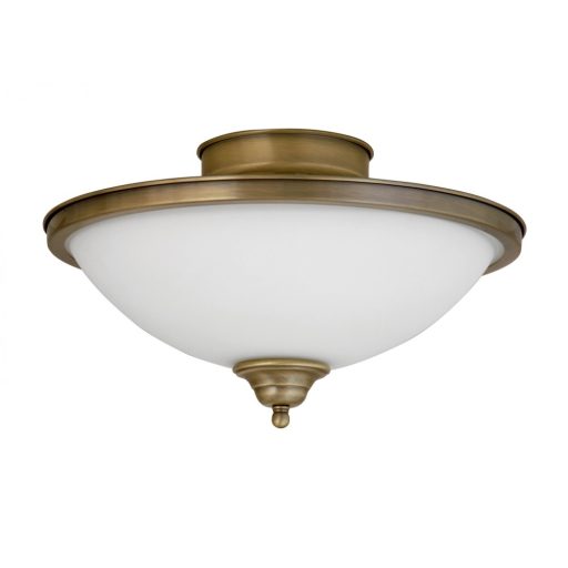 Klasszikus stílusú mennyezeti lámpa, bronz színű, díszített fém vázzal, fehér színű, bronz szegélyes üveg búrával.