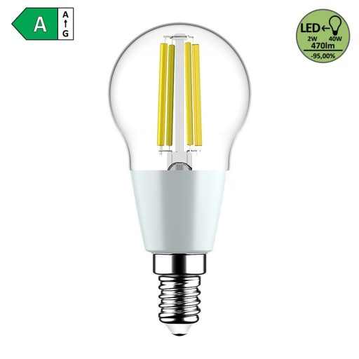 E14 kisgömb típusú, A energiaosztályú 2W-os meleg fehér színhőmérsékletű LED fényforrás. Fényereje megegyezik egy kb. 40W-os hagyományos fényforráséval.