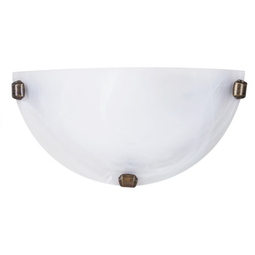 Klasszikus stílusú fali lámpa, fém vázzal, fehér színű alabástrom üveg búrával és bronz színű rögzítő elemekkel.