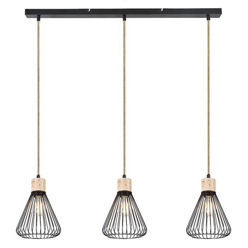 Fekete színű fém vázas függeszték lámpa natúr fa betéttel, fémrács búrával, E27-es foglalattal. A lámpa dekor fényforrással mutat a legjobban, ami nem tartozék.