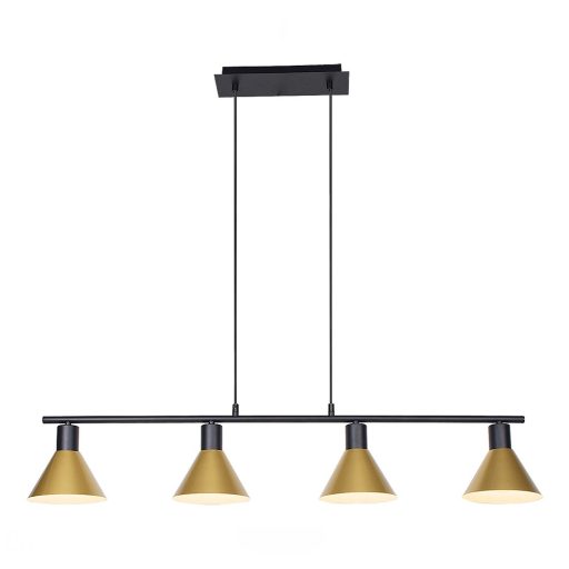 A modern stílusú Alvaro négyes függeszték a lakás számos helyiségébe jó választás lehet: felszerelhetjük a nappaliban, az étkezőben vagy akár a hálószobában. A matt fekete és arany színkombinációban készült fémlámpát lefelé szélesedő, alul nyitott búrák teszik teljessé. A lámpafejek a kábelek segítségével a dísztalphoz rögzített hosszú tartórúdon sorban, egymás mellett helyezkednek el. Az Alvaro hosszúkás, szögletes dísztalp segítségével rögzíthető a mennyezetre. A lámpa négy darab, egyenként legfeljebb 40W teljesítményű fényforrással használható, a foglalatok típusa E27. Ízlésünktől és a felszerelés helyétől függően választhatunk hozzá meleg vagy természetes fehér fényű fényforrásokat. Az Alvaro négyes függeszték méretei a következők: szélessége100cm, egy-egy búra átmérője 16cm, a lámpa belógása 150cm. Ezt a modellt fényforrások nélkül szállítjuk..