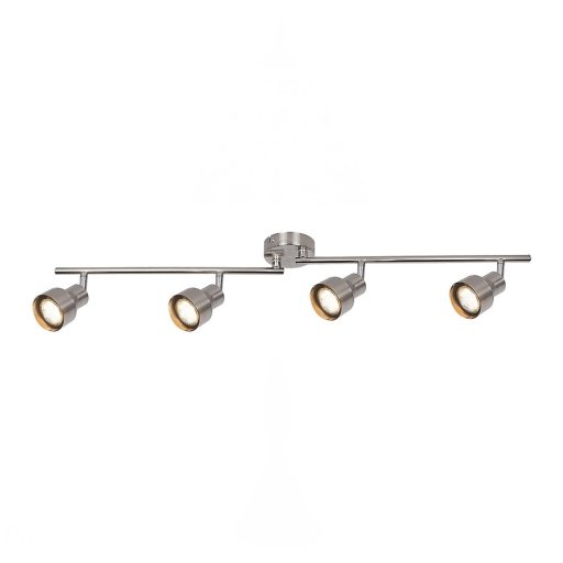 A modern stílusú Blake négyes spotlámpa a lakás számos helyiségébe jó választás lehet: felszerelhetjük a nappaliban, a hálószobában, de az étkezőben vagy akár a konyhában is. A teljes egészében fémből készült, szatinkróm színű lámpa kerek dísztalp segítségével rögzíthető a mennyezetre. Az állítható lámpafejek a dísztalphoz rögzített, két részből álló vízszintes tartórúdon helyezkednek el, segítségükkel könnyen bevilágíthatunk egy tágasabb helyiséget is. A Blake négy darab, egyenként legfeljebb 50W teljesítményű fényforrással használható, a foglalatok típusa GU10. Ízlésünktől és a felszerelés helyétől függően választhatunk hozzá meleg vagy természetes fehér fényű fényforrásokat. A négyes spot lámpa méretei a következők: szélessége 86cm, magassága 14,5cm, mennyezettől mért távolsága 12cm. Ezt a modellt fényforrások nélkül szállítjuk..