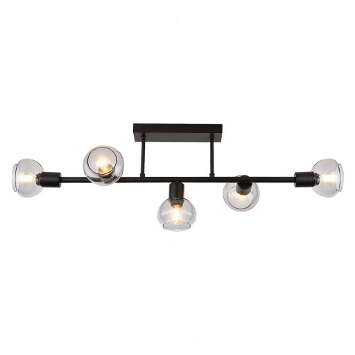 A modern stílusú Sullivan ötös mennyezeti lámpát elsősorban a nappaliba vagy az étkezőbe ajánljuk, de felszerelhetjük a hálószobában is. A fémből készült, fekete színű lámpatestet gömbölyded, színezett üvegbúrák egészítik ki, a lámpa szögletes dísztalp segítségével rögzíthető a mennyezetre. A lámpafejek a dísztalphoz rögzített hosszú tartórúdon helyezkednek el és hatékony bevilágítást biztosítanak a szobában, mivel mind eltérő irányba tekintenek. A Sullivan öt darab, egyenként legfeljebb 40W teljesítményű fényforrással használható, a foglalatok típusa E14. Ízlésünktől és a felszerelés helyétől függően választhatunk hozzá meleg vagy természetes fehér fényű fényforrásokat. A Sullivan mennyezeti lámpa méretei a következők: szélessége 83cm, magassága 25,5cm, mennyezettől mért távolsága 27cm. Ezt a modellt fényforrások nélkül szállítjuk..