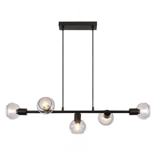 A modern stílusú Sullivan ötös függesztéket elsősorban a nappaliba vagy az étkezőbe ajánljuk, de felszerelhetjük a hálószobában is. A fémből készült, fekete színű lámpatestet gömbölyded, színezett üvegbúrák egészítik ki, a lámpa szögletes dísztalp segítségével rögzíthető a mennyezetre. A lámpafejek a kábelekkel a dísztalphoz rögzített hosszú tartórúdon helyezkednek el és hatékony bevilágítást biztosítanak a szobában, mivel mind eltérő irányba tekintenek. A Sullivan öt darab, egyenként legfeljebb 40W teljesítményű fényforrással használható, a foglalatok típusa E14. Ízlésünktől és a felszerelés helyétől függően választhatunk hozzá meleg vagy természetes fehér fényű fényforrásokat. A Sullivan ötös függeszték méretei a következők: szélessége 83cm, magassága 25cm, belógása 120cm. Ezt a modellt fényforrások nélkül szállítjuk..