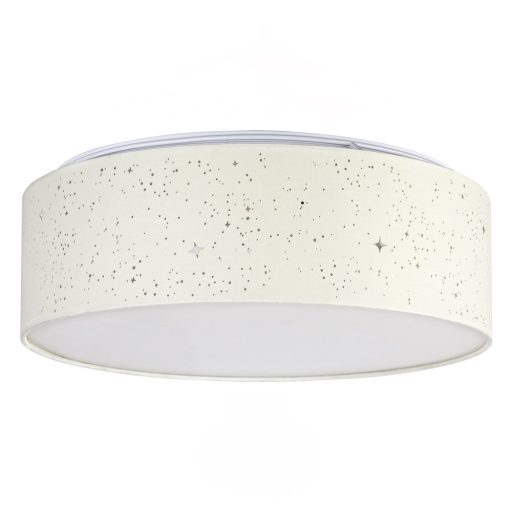 Fehér színű fém vázas mennyezeti lámpa krém színű lyukacsos textil búrával, alul a fény lágyítására szolgáló lappal, beépített meleg fényű LED fényforrással.