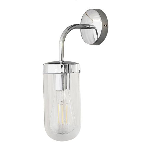 A modern stílusú Yago fürdőszobai fali lámpát elsősorban a mosdóhoz tartozó tükör fölé ajánljuk, de elhelyezhetjük akár a teraszon is vagy máshol a ház külső falán. A krómszínű alumínium lámpatestből és henger alakú, átlátszó üvegbúrából álló modell egy darab, legfeljebb 60W teljesítményű fényforrással használható, a foglalat típusa E27. A Yago krómszínű, kerek dísztalp segítségével rögzíthető a falra. A lámpa IP44-es védettsége garantálja, hogy legfeljebb 1 mm átmérőjű tárgyak behatolása ellen, valamint bármilyen irányból fröccsenő víz ellen védett. A fürdőszobai fali lámpa méretei a következők: szélessége 9,7cm, magassága 32,5cm, faltól mért távolsága 17cm, beépítési átmérője 90mm. Ezt a modellt fényforrás nélkül szállítjuk.