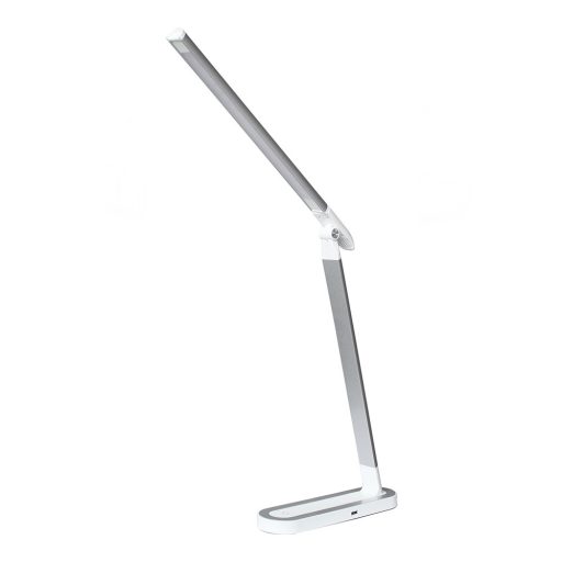 Ezüst és fehér színű, fém és műanyag anyagokból készült íróasztali lámpa állítható fejjel, érintőkapcsolós fényerőszabályzóval, beépített természetes fehér fényű LED fényforrással és USB aljzattal.