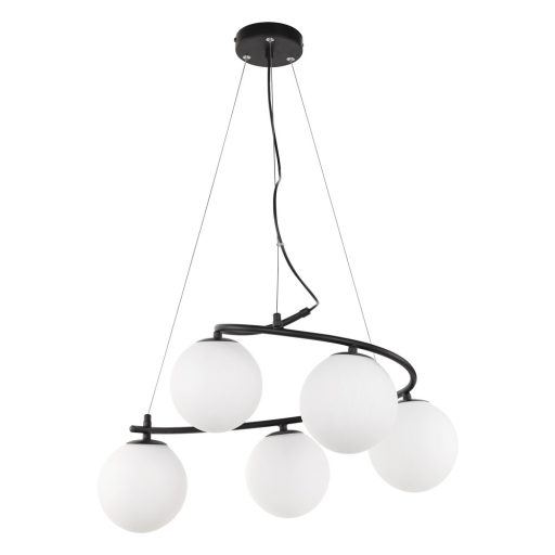 Fekete színű fém vázas függeszték lámpa fehér színű üveg búrával.