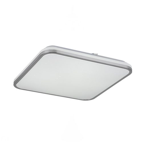 Króm színű fém vázas mennyezeti lámpa csillagos égbolt effektes fehér és króm színű műanyag búrával, beépített LED fényforrással. A lámpához távirányító tartozik, mely segítségével állítható a LED fényereje, színhőmérséklete(3000-6500K), illetve a lámpa memória funkcióval is rendelkezik.