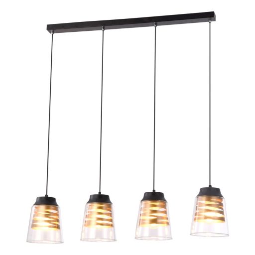 Matt fekete színre festett fém vázas függeszték lámpa átlátszó üveg búrával, arany színű spirálos dekorral, fekete színű textil kábellel.