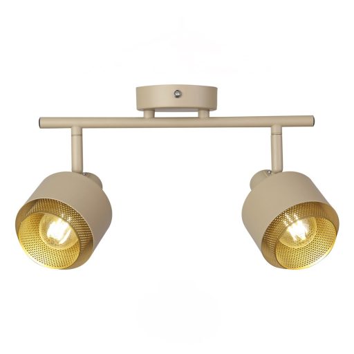 Világos barna színű fém vázas spot lámpa arany színű lyukacsos fém dekoros állítható búrával.