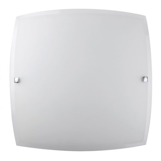 Szögletes fali/mennyezeti lámpa, szatinált króm színű fém vázzal és átlátszó keretes, opál üveg búrával.