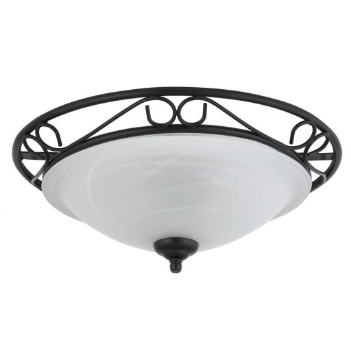 Klasszikus stílusú mennyezeti lámpa, matt fekete színű, díszített fém vázzal, fehér színű, alabástrom üveg búrával.