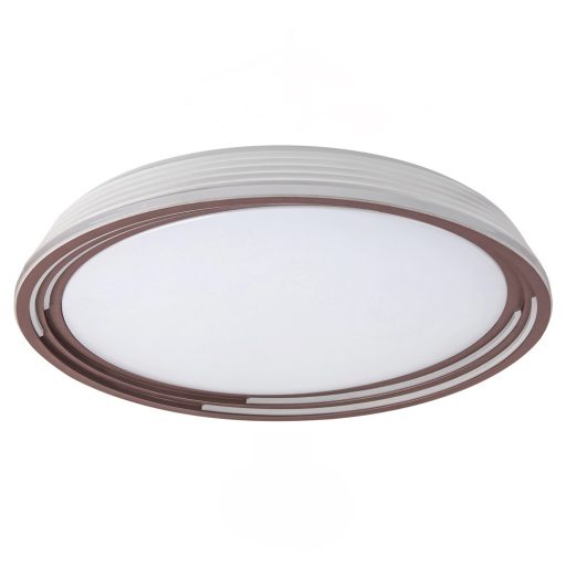 Fehér és barna színű fém és műanyag anyagokból készült mennyezeti lámpa meleg fényű beépített LED fényforrással. A lámpa fényereje fali kapcsoló segítségével 3 lépcsőben(10%,40%,100%) szabályozható.