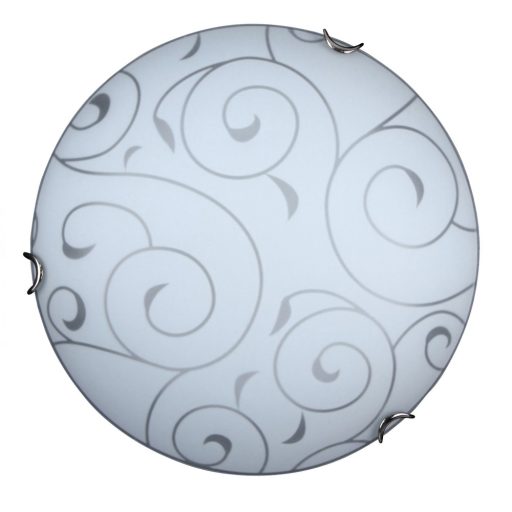 Modern stílusú mennyezti lámpa, fém vázzal, fehér alapon átlátszó mintás üveg búrával, króm színű rögzítő elemekkel.