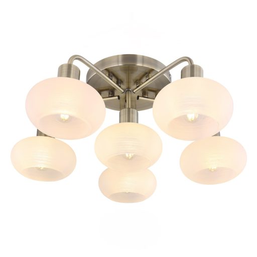 Antik bronz színű fém vázas mennyezeti lámpa fehér színű, fánk formájú üveg búrával.