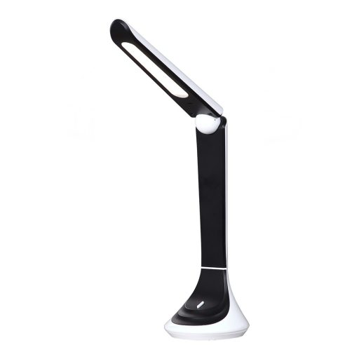 Fekete-fehér színű műanyag íróasztali lámpa állítható fejjel és beépített természetes fehér fényű LED fényforrással, lámpatesten lévő kapcsolóval.