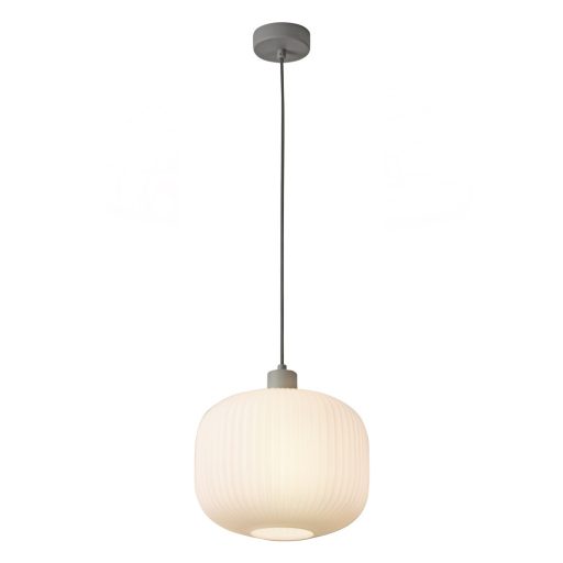 Szürke színű fém vázas függeszték lámpa fehér színű barázdált üveg búrával, textil kábellel.