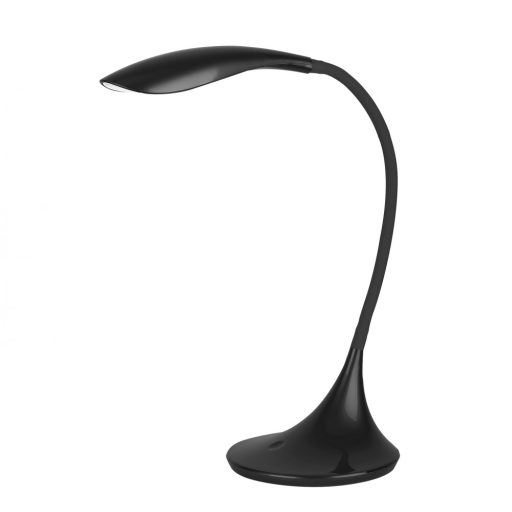 Modern, fekete színű, műanyag, állítható fejű íróasztali lámpa. A lámpa beépített LED fényforrással, 3 lépcsőben, érintőkapcsolóval szabályozható fényerővel rendelkezik.