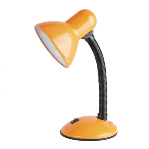 Modern stílusú íróasztali lámpa, narancssárga és fekete színű fém vázzal, narancssárga búrával. A lámpa állítható fejjel és lámpatestre szerelt kapcsolóval rendelkezik.