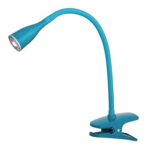 Modern megjelenésű csíptethető asztali lámpa beépített energiatakarékos LED fényforrással. 35 cm magas, kék színű műanyag szerkezet pozícionálható fejjel, kapcsolóval. A lámpatestbe beépített LED fényforrás A+ energiaosztály besorolású. 4,5W teljesítmény mellett 330 lumenes fényerőt, valamint 3000 Kelvines, melegfehér színű fényt biztosít. A lámpatestben a fényforrás nem cserélhető.