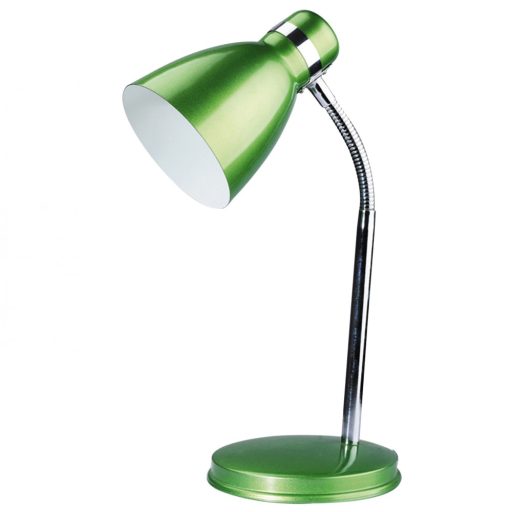 Modern stílusú íróasztali lámpa, zöld és króm színű fém vázzal, zöld búrával. A lámpa állítható fejjel és vezetékre szerelt kapcsolóval rendelkezik.