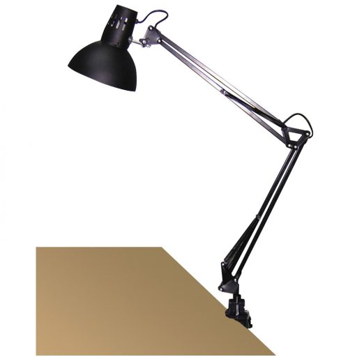 Satus íróasztali lámpa, fekete színű fém testtel és búrával, állítható fejjel és karral, vezetékre szerelt kapcsolóval.