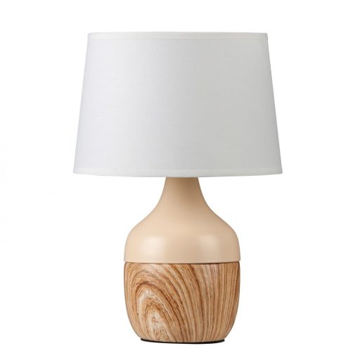 Természetes stílusú, dekoratív asztali lámpa, bézs színű, fa hatású kerámia testtel és fehér színű textil lámpaernyővel. A lámpa vezetékre szerelt kapcsolóval rendelkezik.