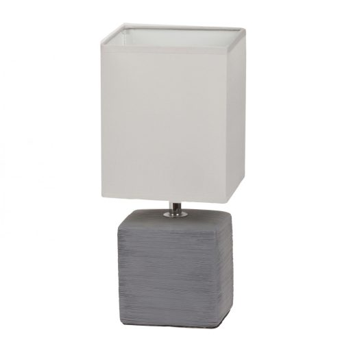 Modern stílusú, szögletes asztali lámpa, szürke színű kerámia testtel és szürke színű textil lámpa ernyővel. A lámpa vezetékre szerelt kapcsolóval rendelkezik.