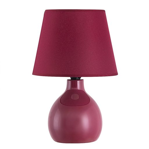 Időtlen megjelenésű éjjeli lámpa 1 db foglalattal. 28 cm magas, 17 cm átmérőjű lámpatest bordó színű kerámia lámpatesttel és textil lámpaernyővel, vezetékes kapcsolóval és IP20-as védettséggel. Az asztali lámpa E-14-es foglalatkialakítású, max. 40W teljesítményű izzóval használható.