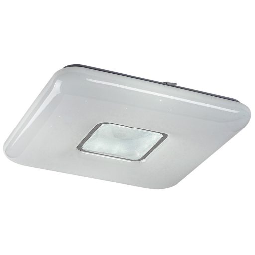 Fehér színű fém vázas mennyezeti lámpa csillagos égbolt effektes fehér és króm színű műanyag búrával, beépített LED fényforrással. A lámpához távirányító tartozik, mely segítségével állítható a LED fényereje, színhőmérséklete(3000-6500K).