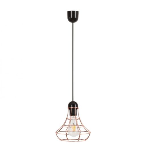 Vintage stílusú, fekete színű függeszték, fix magasságú műanyag függeszővel, és réz színű drótos búrával.