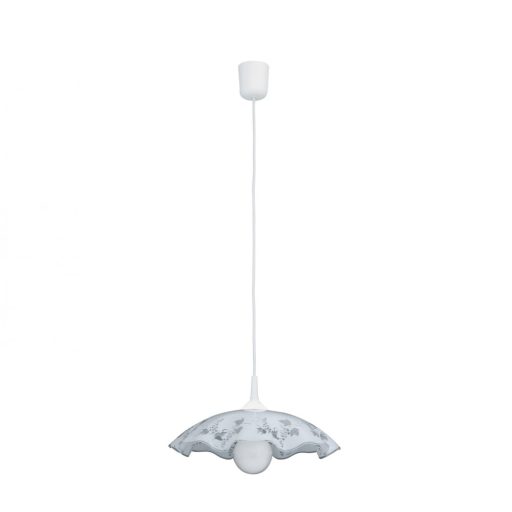 Klasszikus stílusú függeszték, fehér színű műanyag vázzal, fehér színű, átlátszó, szőlő mintás üveg búrával.