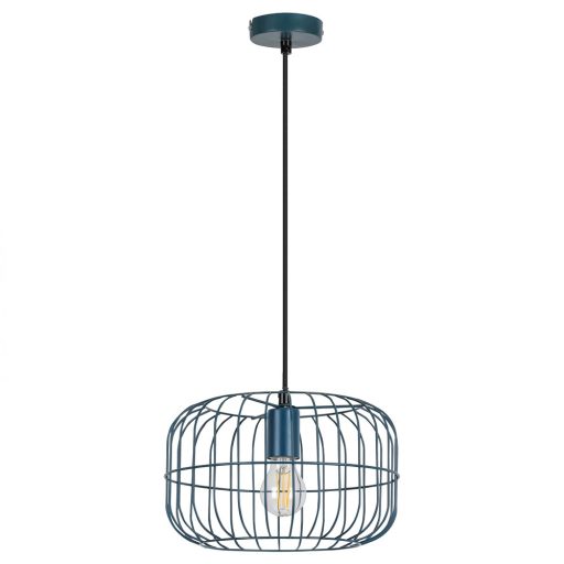Acél kék színű fém vázas függeszték lámpa fémdrót búrával, fekete színű textil kábellel.