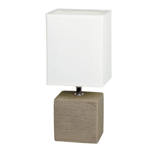 Modern stílusú, szögletes asztali lámpa, kakaó színű kerámia testtel és natúr színű textil lámpa ernyővel. A lámpa vezetékre szerelt kapcsolóval rendelkezik.