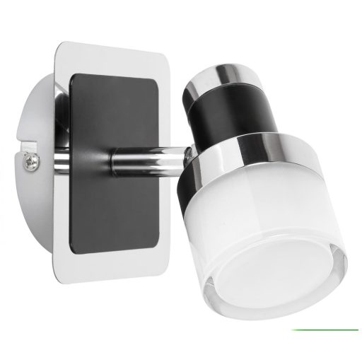 Króm színű fém vázas fekete dekoros fali lámpa billenthető fejjel, opálos műanyag búrával, beépített LED fényforrással, IP44-es védelmmel.