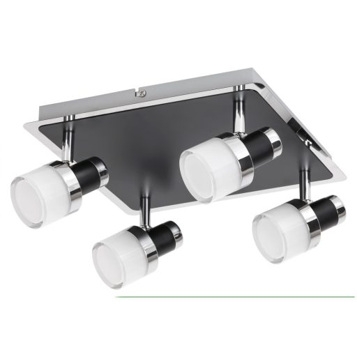 Króm színű fém vázas fekete dekoros mennyezeti lámpa billenthető fejjel, opálos műanyag búrával, beépített LED fényforrással, IP44-es védelmmel.
