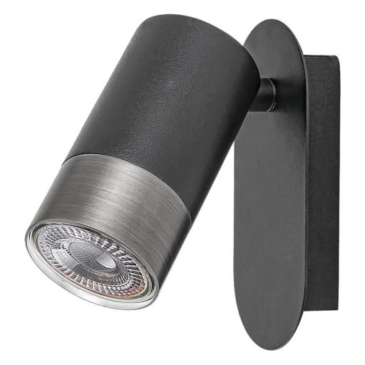 Matt fekete színű fém spot lámpa ezüst gyűrű dekoros, mozgatható fejjel, GU10-es foglalattal.