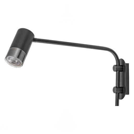 Matt fekete színű fém falikar ezüst gyűrű dekoros, mozgatható fejjel, GU10-es foglalattal, vezetékre szerelt kapcsolóval, textil kábellel.